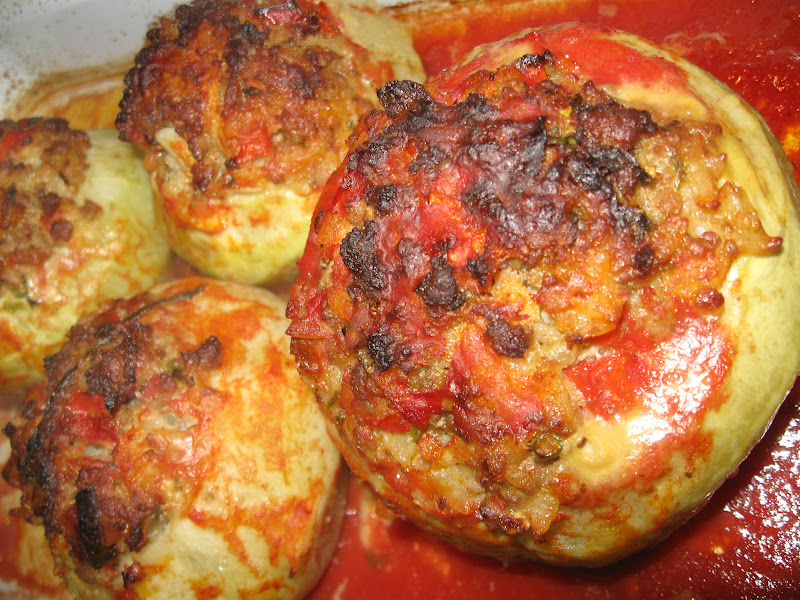 6. Asezam intr-o tava unsa cu ulei guliile umplute cu varf, apoi le stropim cu o cana de bulion, cu putin ulei pe fiecare, apoi mai adaugam cam o cana-doua de apa in tava si dam totul la cuptor cam 1 ora si 10 minute, la 185-190 grade Celsius. Noi am stropit farfuriile cu sosul de rosii din tava iar Cristi a plusat si cu smanatanica. Pofta sa aveti!